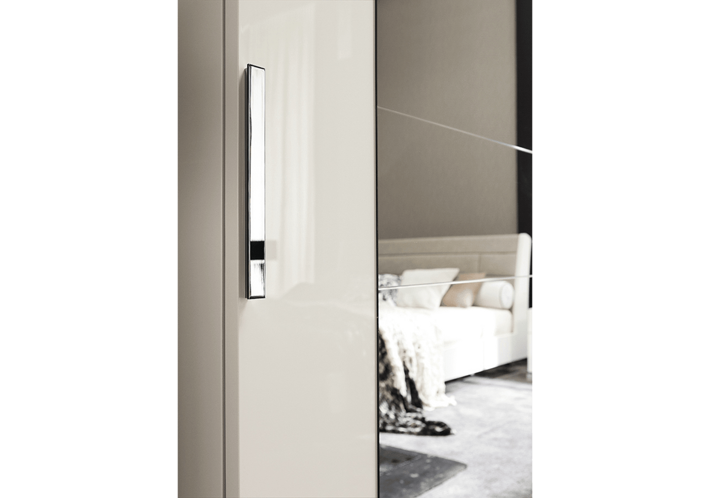 It features chrome metal handle profiles positioned vertically which “cut” the fronts, marking changes in the depth of the panels.