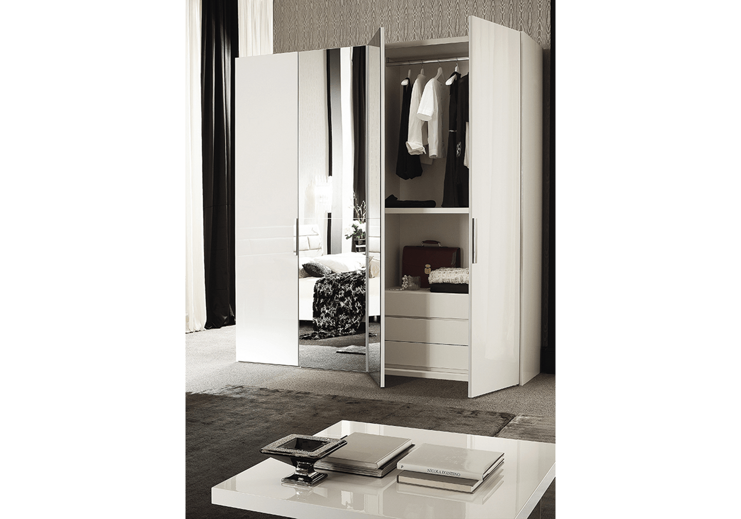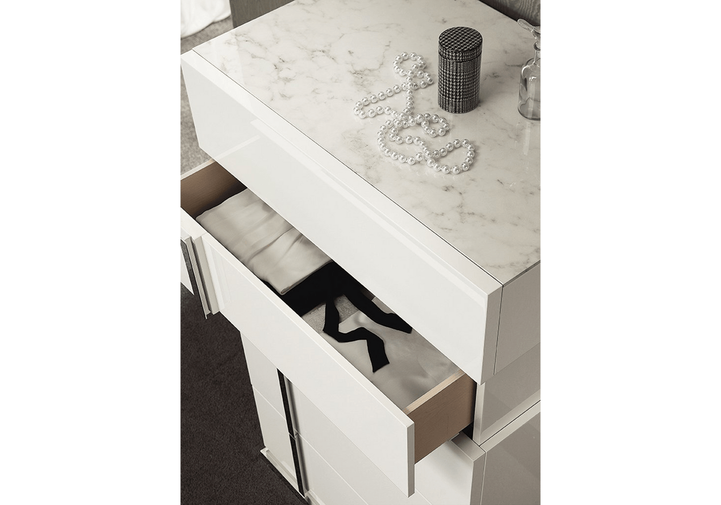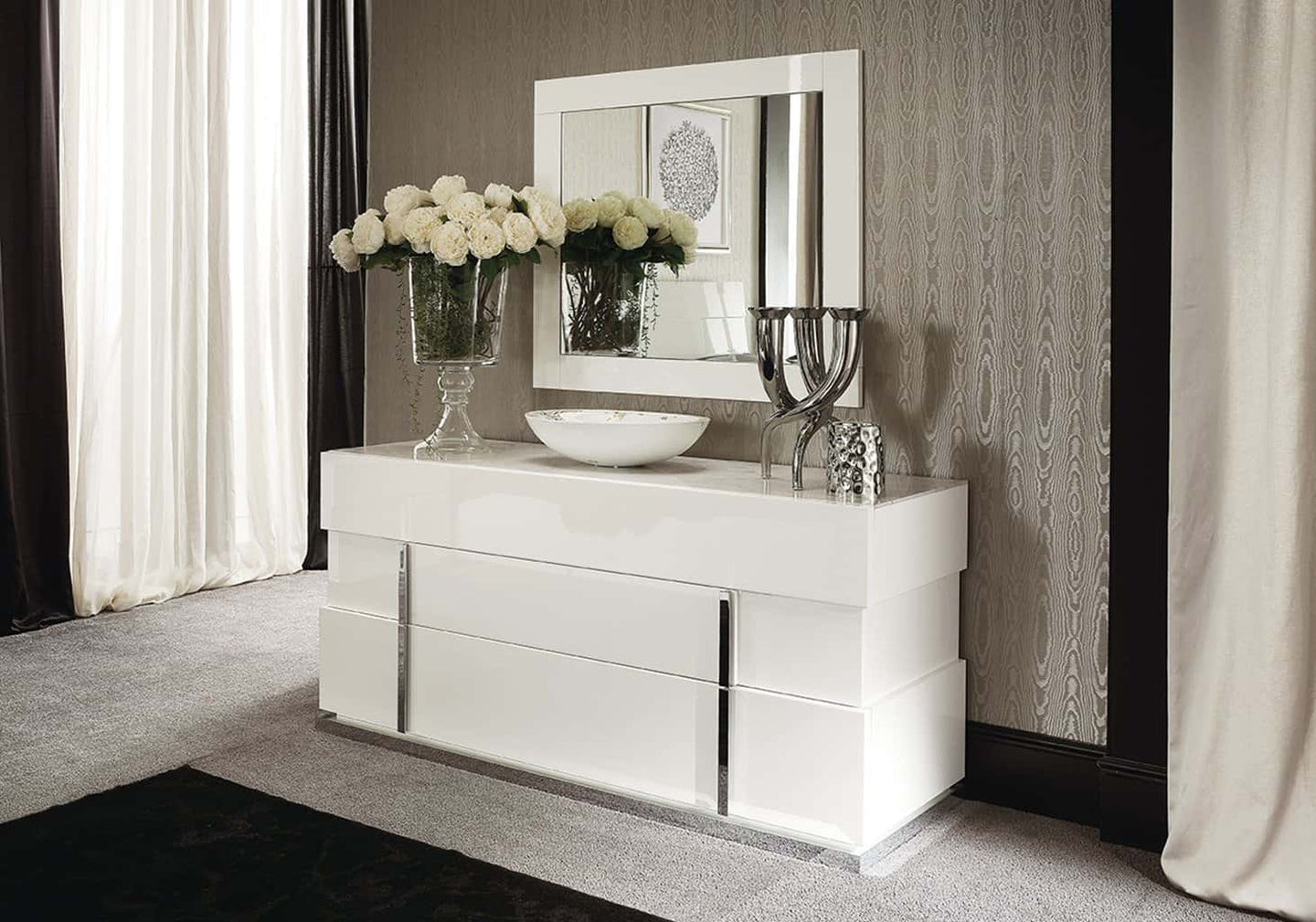 High gloss Bianco lacquer and tops in Carrara marble finish define this collection made up of bed, bedside tables, drawer unit, dresser, mirror, wardrobes and vanity unit.