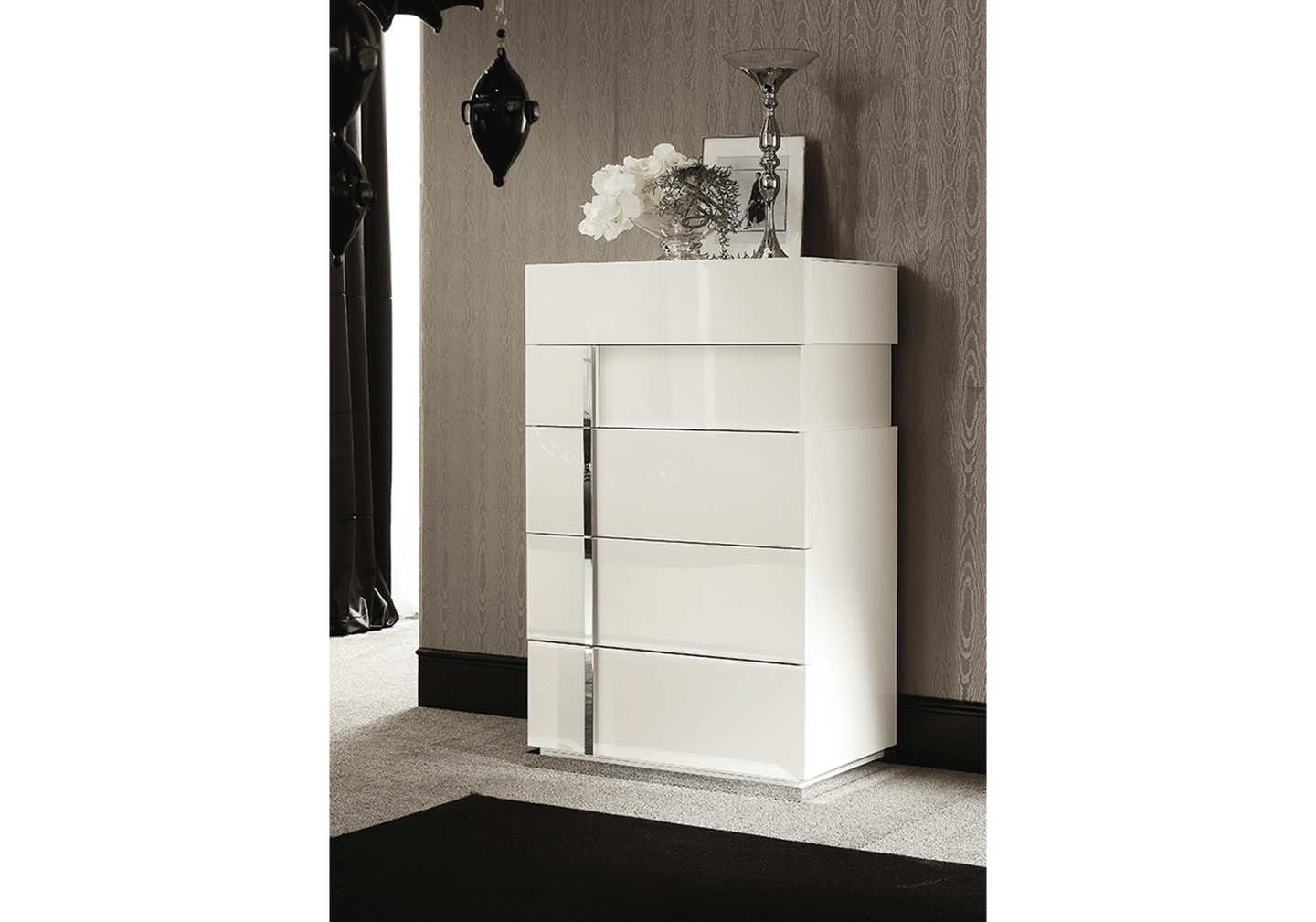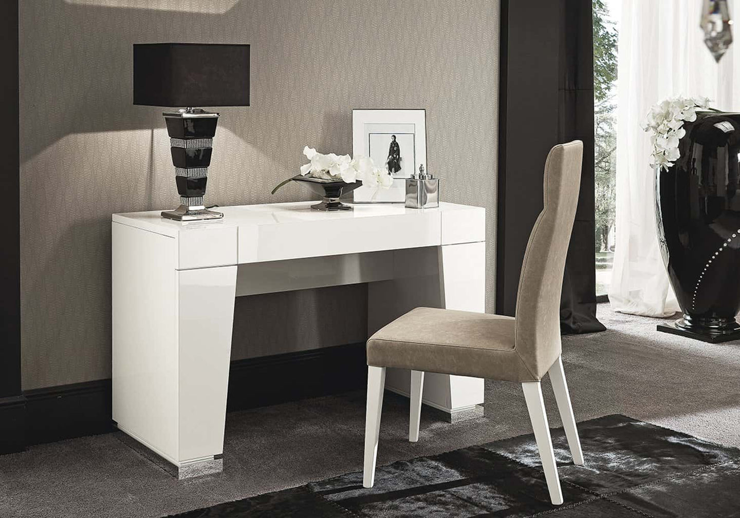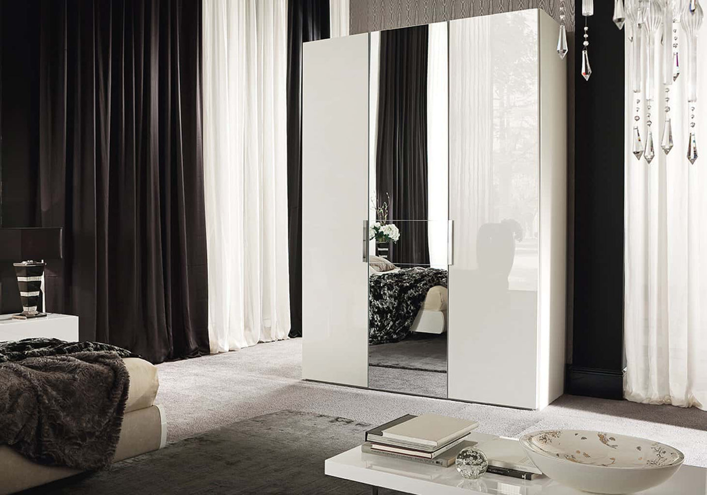 High gloss Bianco lacquer and tops in Carrara marble finish define this collection made up of bed, bedside tables, drawer unit, dresser, mirror, wardrobes and vanity unit.
