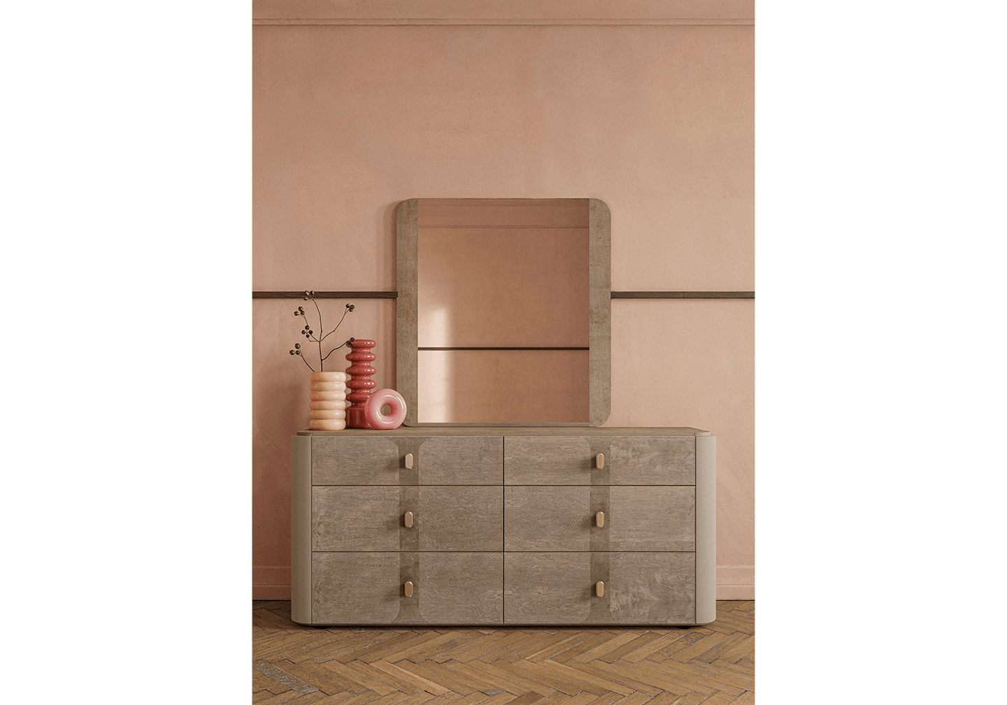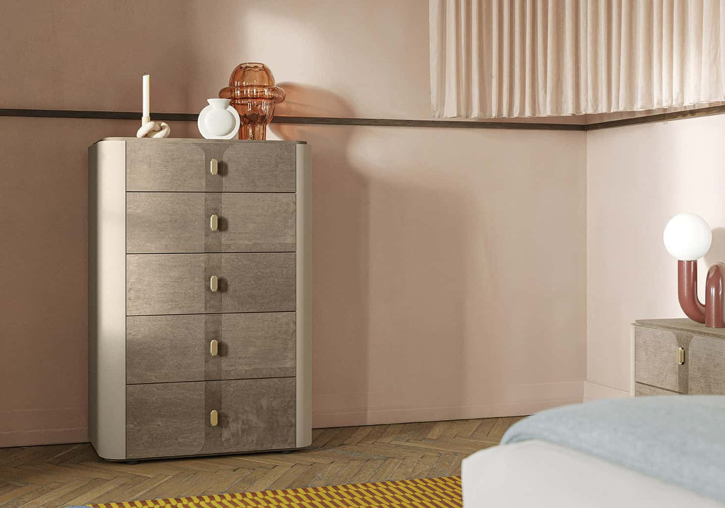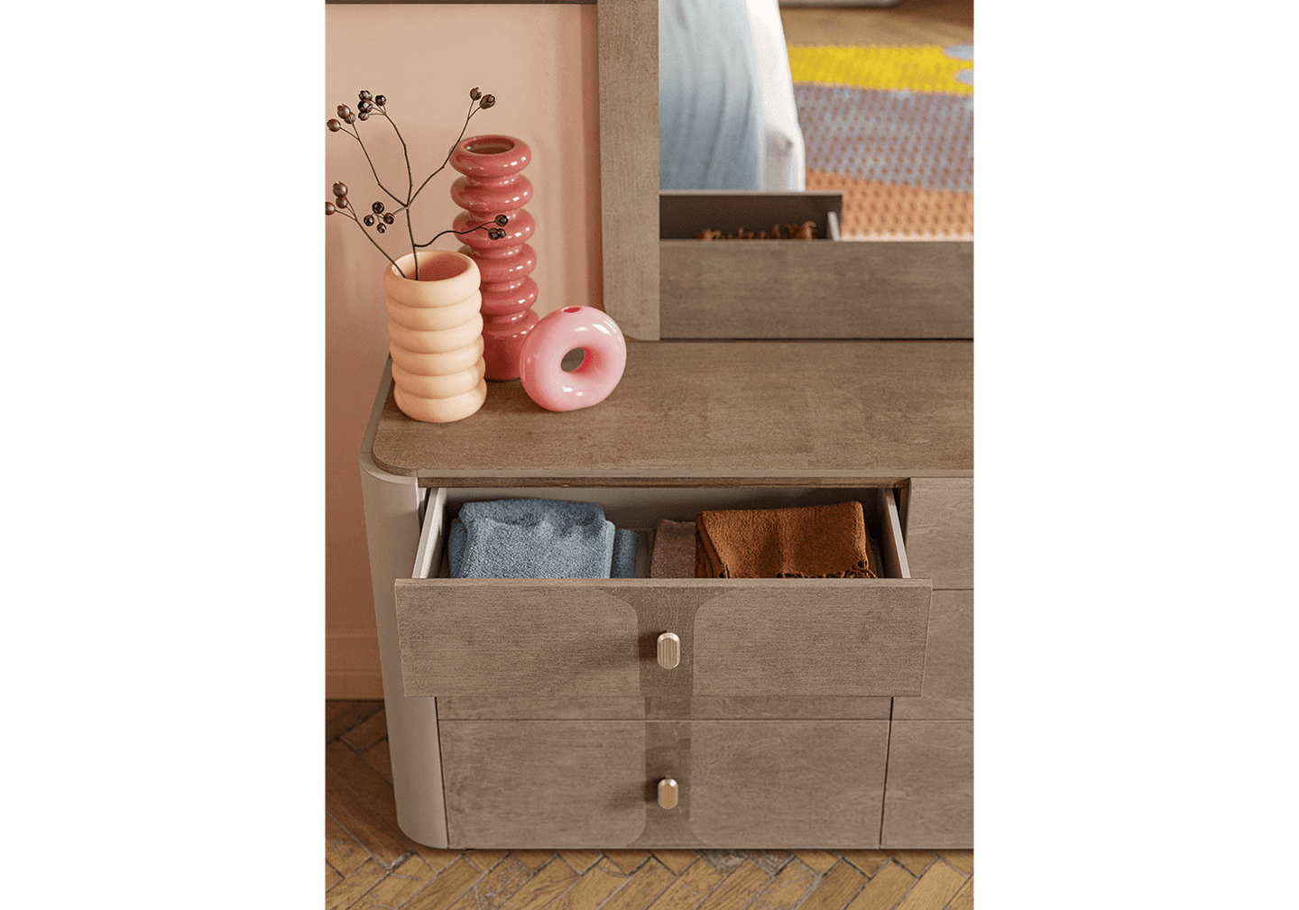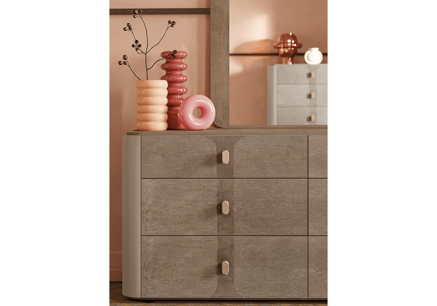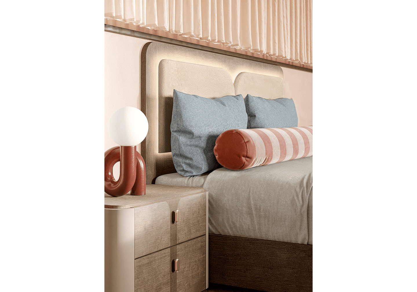 The Hebe bed features warm, light brown hues with boucle textile details on its padded headboard, blending modern softness with sophisticated design. The rounded edges add a touch of contemporary elegance, creating a refined combination of architectural finesse and luxurious comfort.