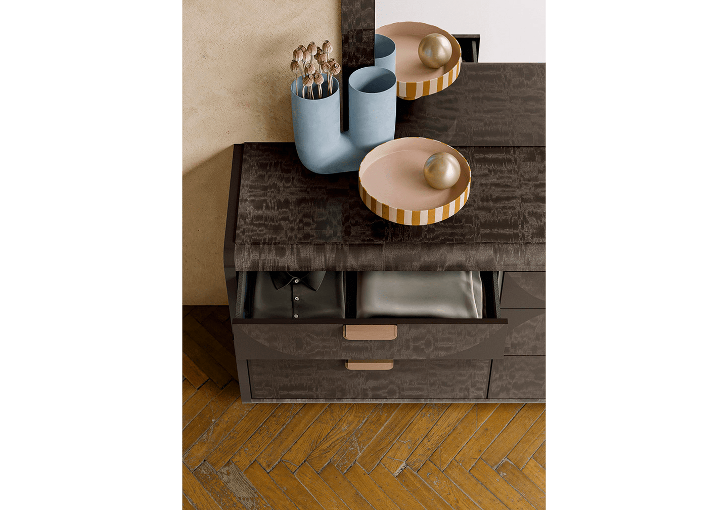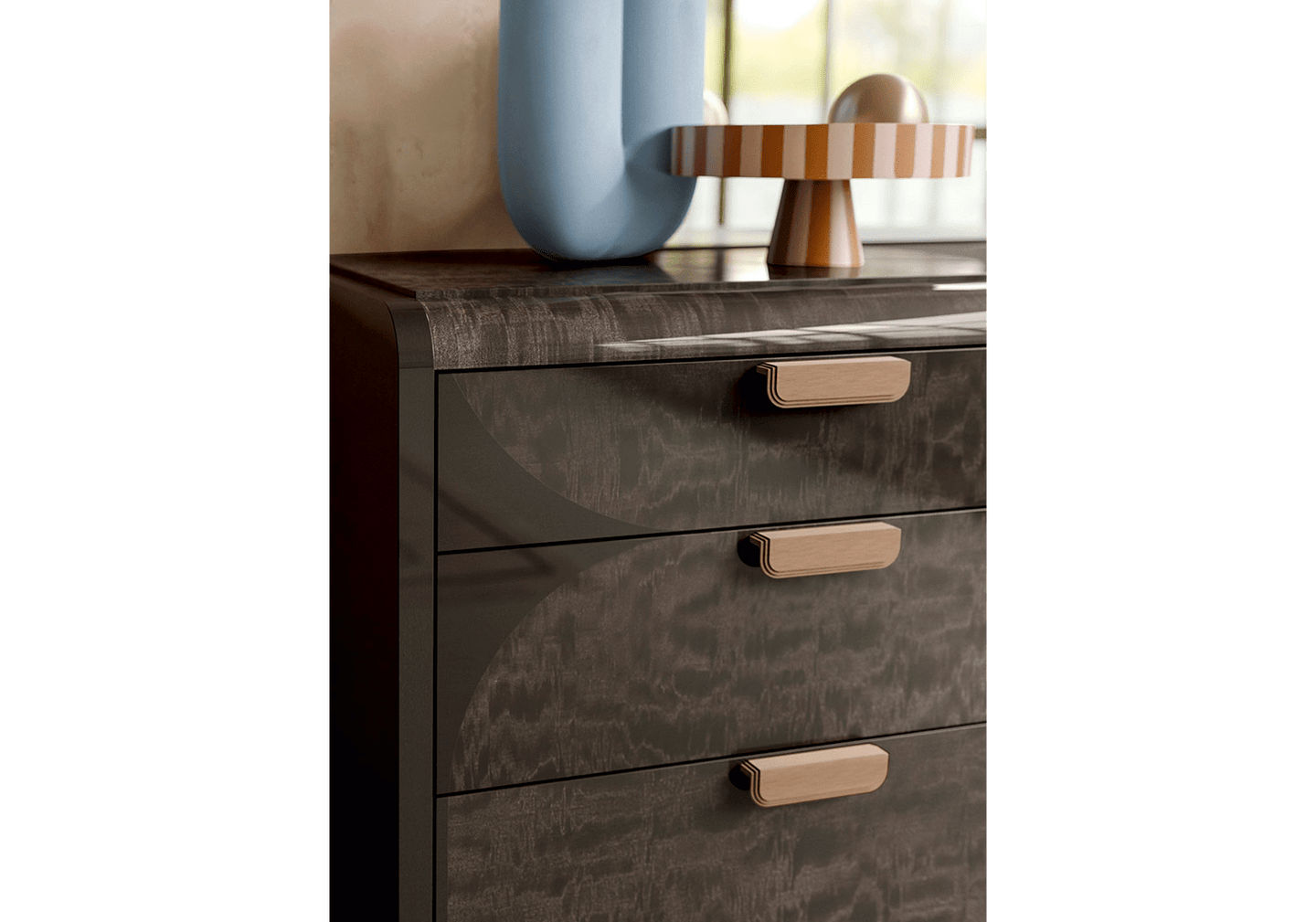 The Nyx bed showcases rich chocolate tones and boucle textile details on its padded headboard, blending modern softness with sophisticated design. The rounded edges add a touch of modern elegance, embodying Milanese chic by marrying architectural finesse with luxurious comfort