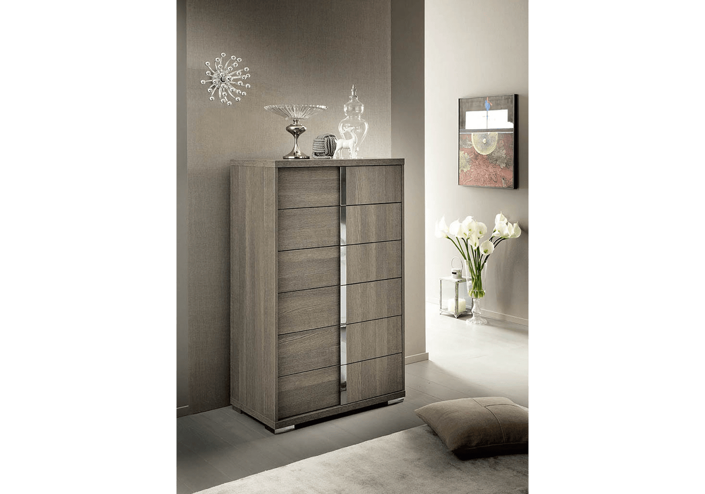 The innovative Grey oak eco veneer texture of the Tivoli bedroom furniture collection adds the warmth of wood to any bedroom whilst fully respecting the environment. The range includes bed, dresser, bedside tables, tall chest of drawers and mirror.