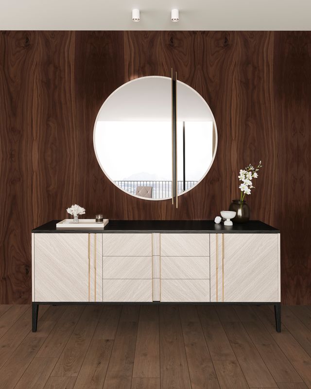 Linear Natural Matte Wood with Leanear Black Finish and Smoked Brass Accents.