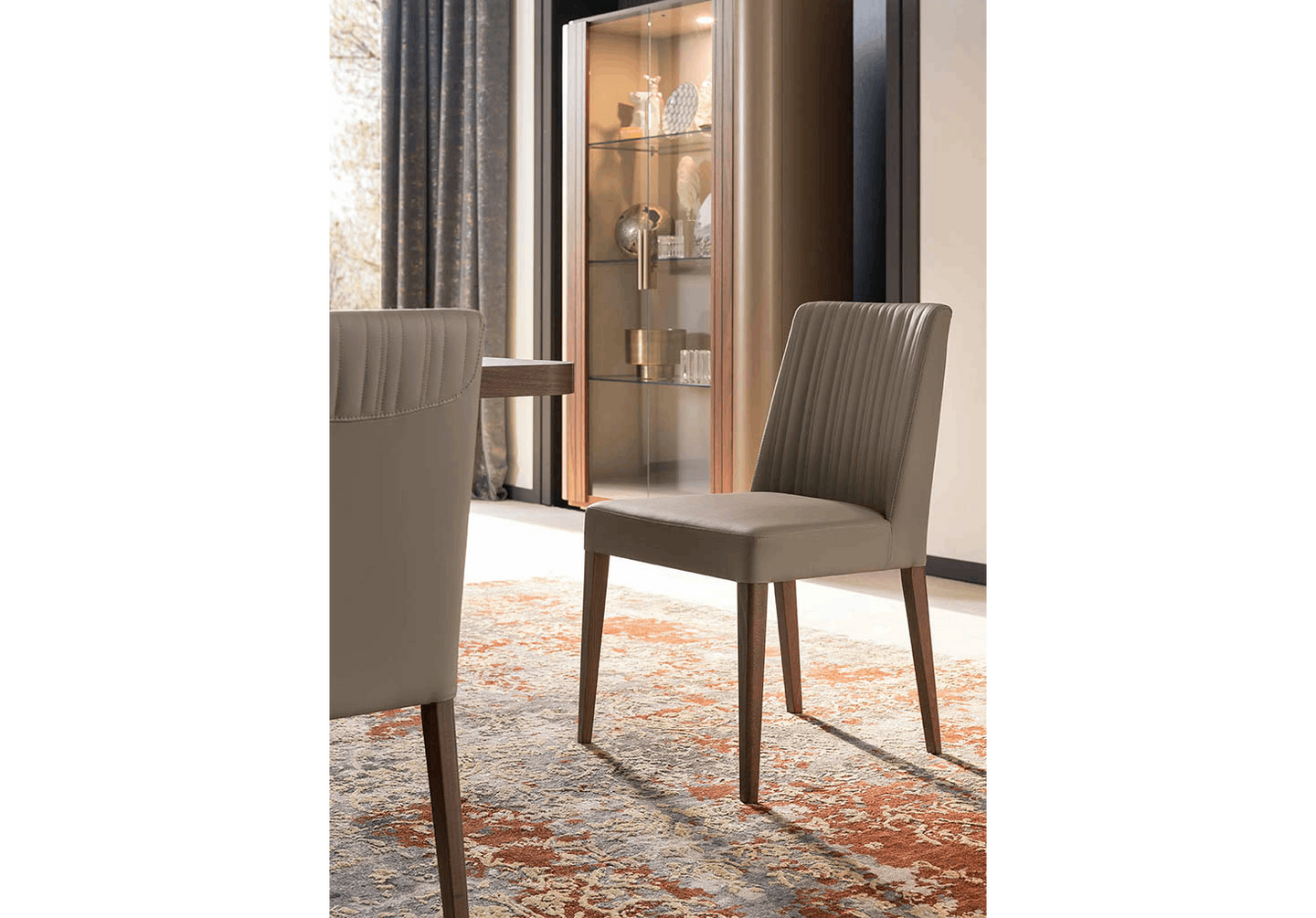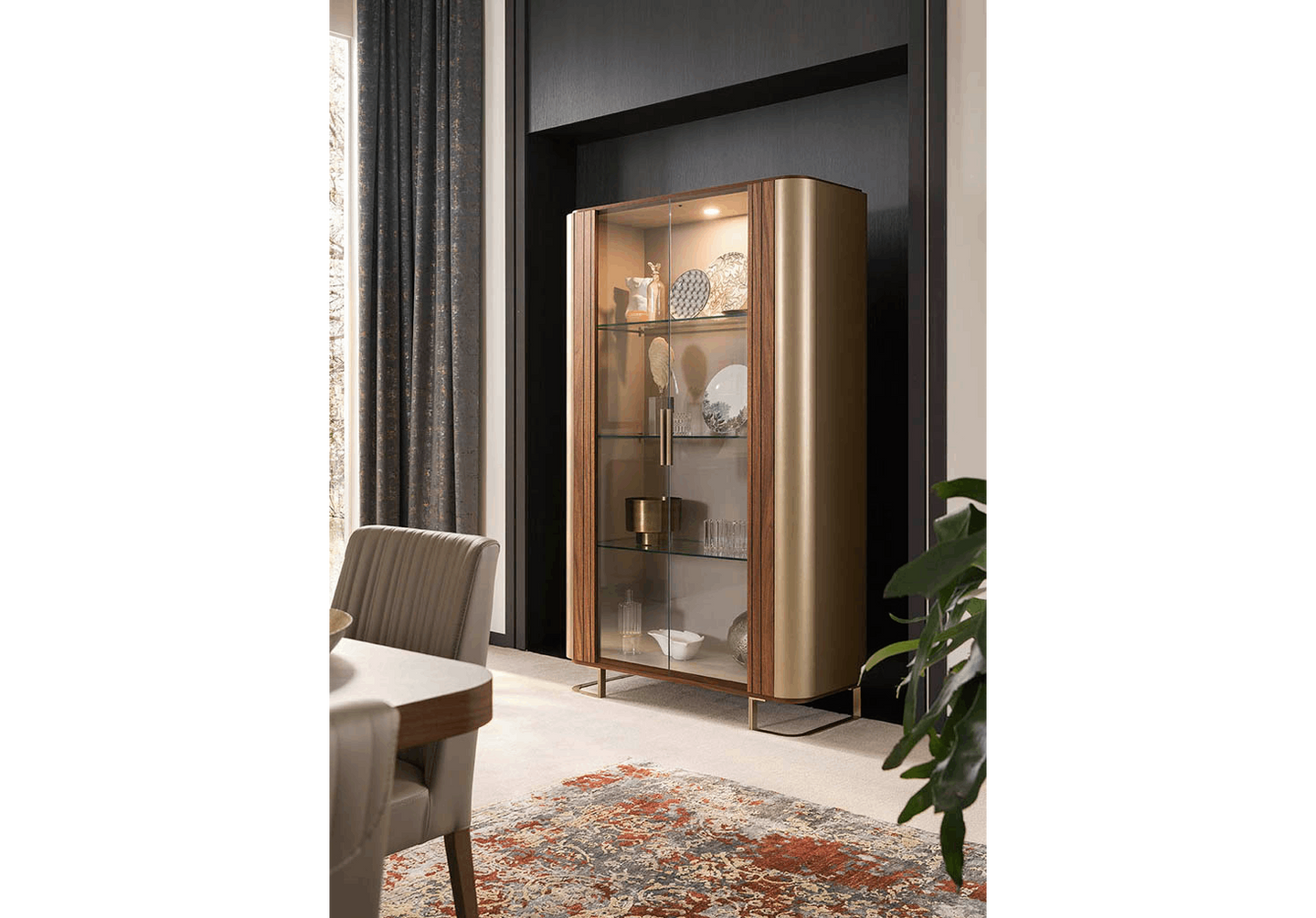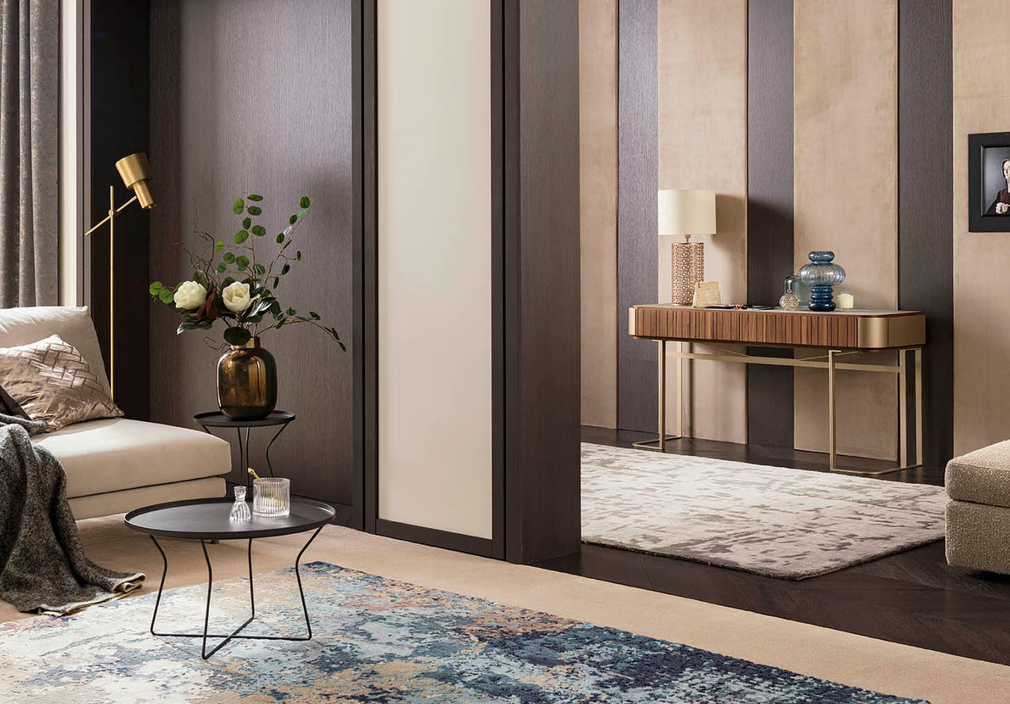 In a Hera dining room, elegant curves and a combination of finishes, such as Canaletto walnut and Botticino ecological stone, feature on the table.