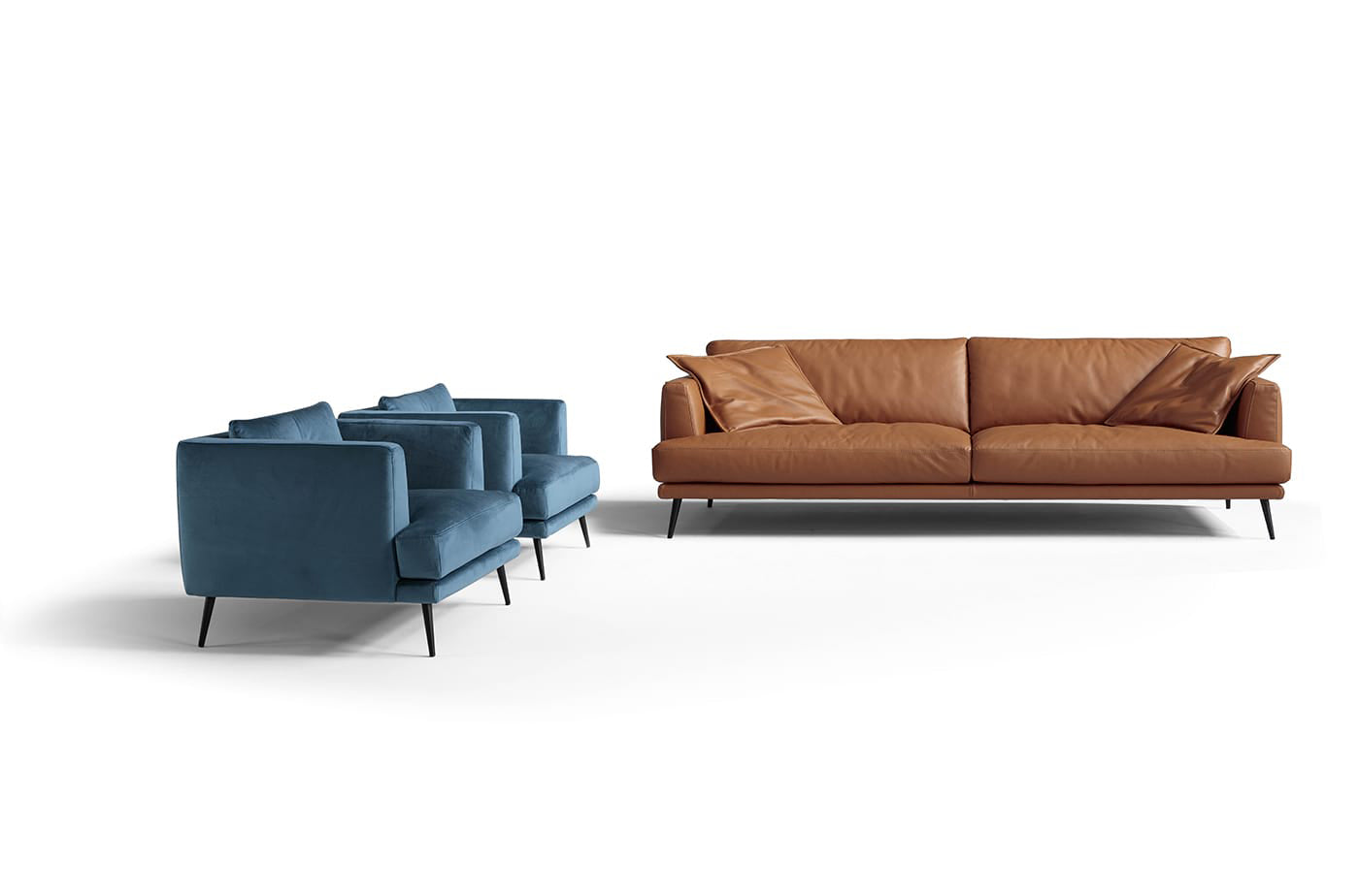 Seat cushions: density 30 kg / mc. External goose down layer. Back cushions: density 23 kg / mc. External goose down layer. Armrest : Top layer density 40 kg/mc with frame padding covers in polyurethane foam density 21 kg / mc, covered with 200 g / m2 dacron layer