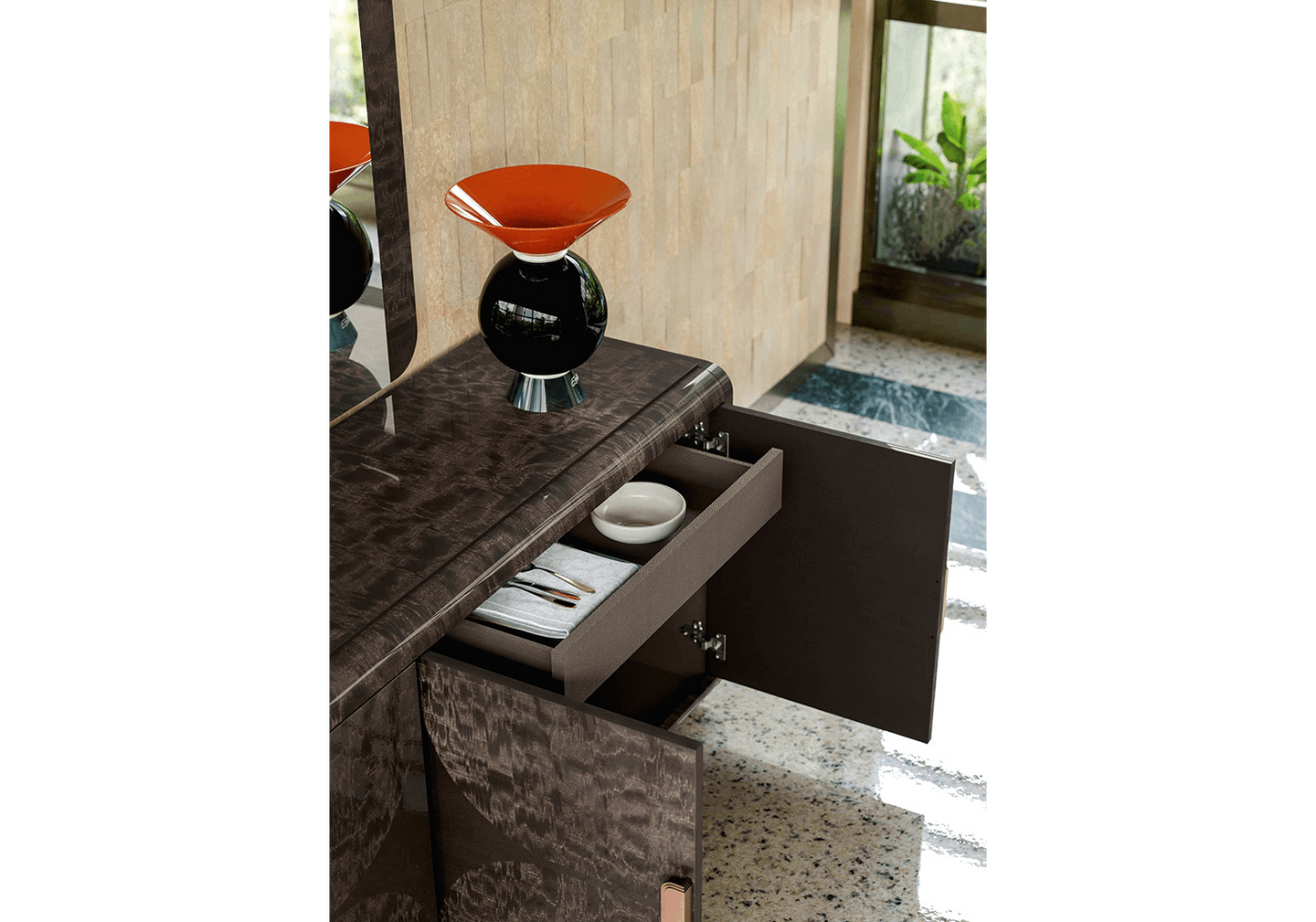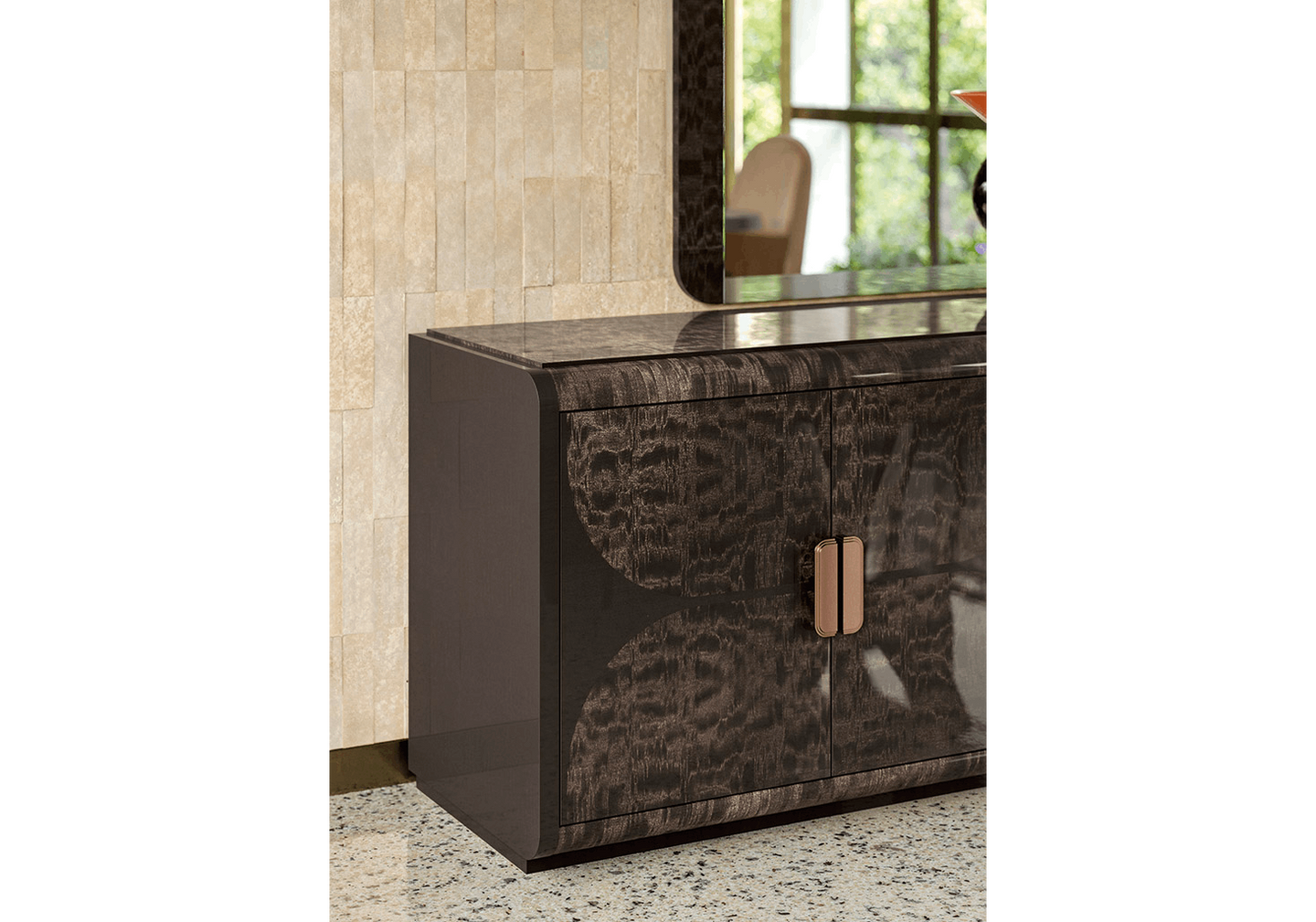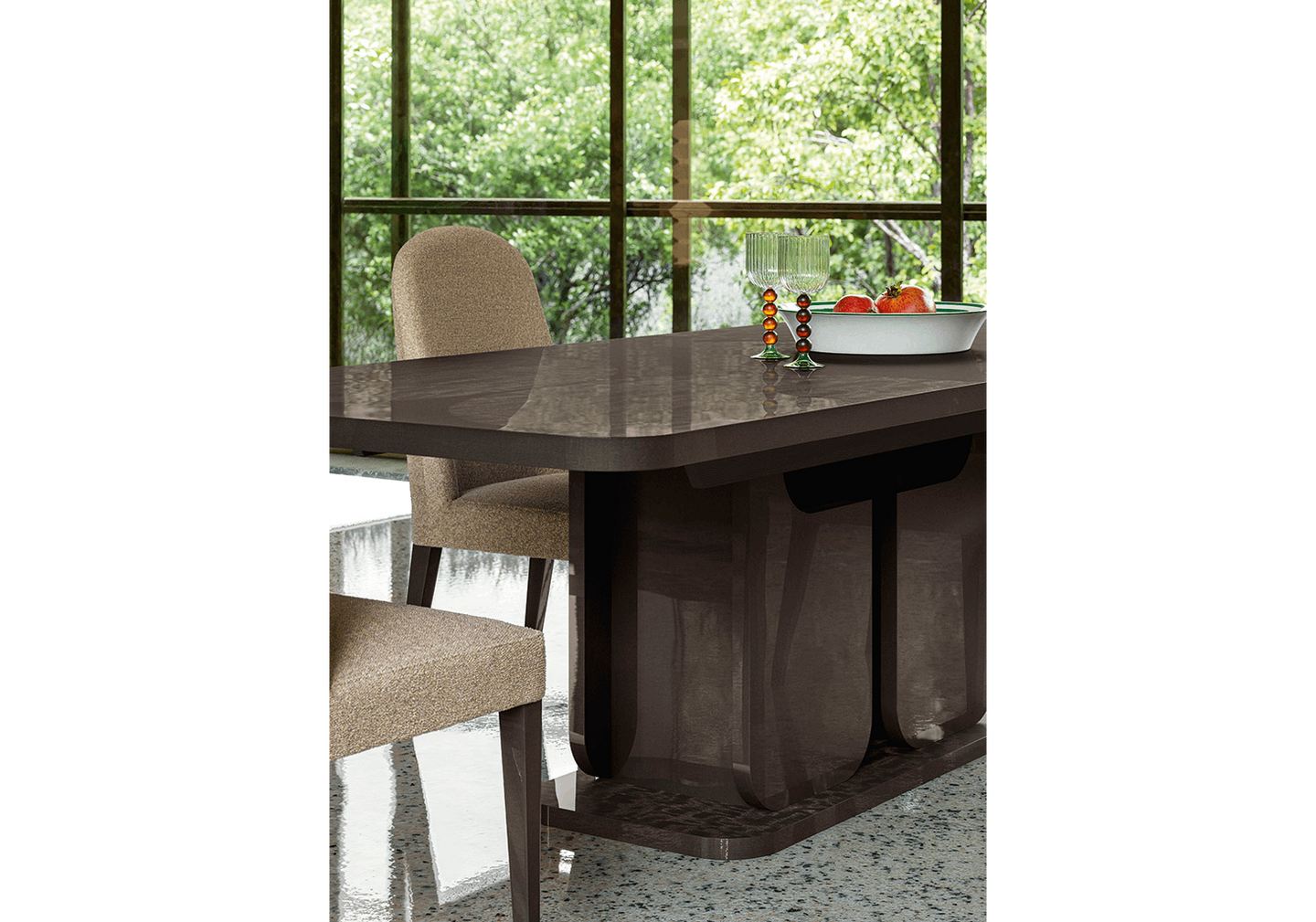 The Nyx table features a rich chocolate high-gloss finish with geometric round inlays on the top and a curved-shaped base, combining artistic sophistication with luxurious refinement for a standout piece in any interior.