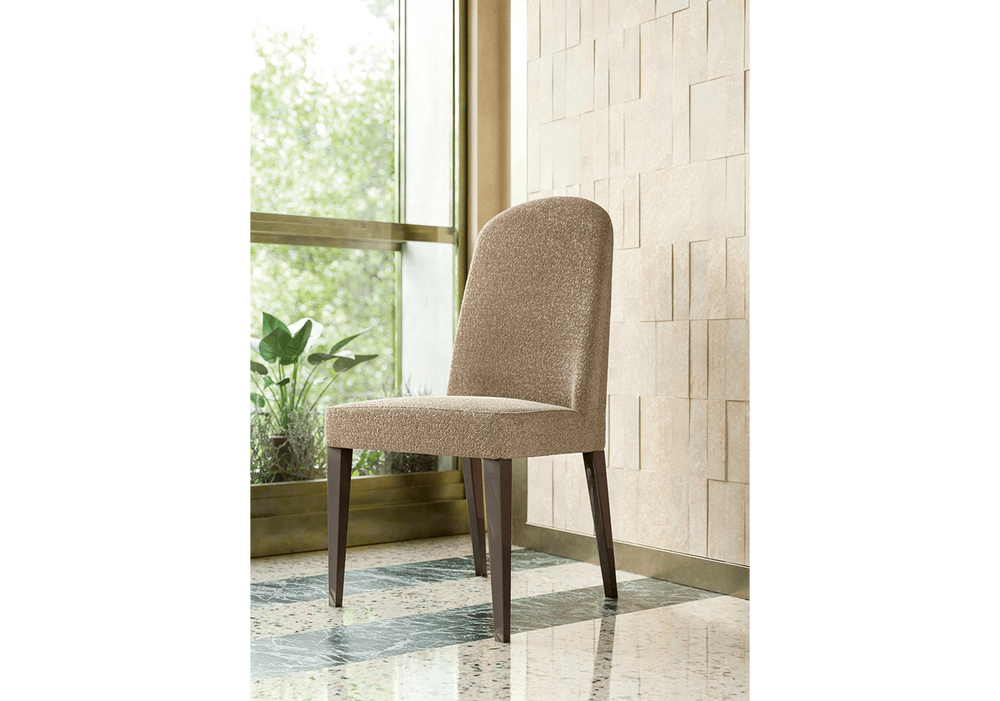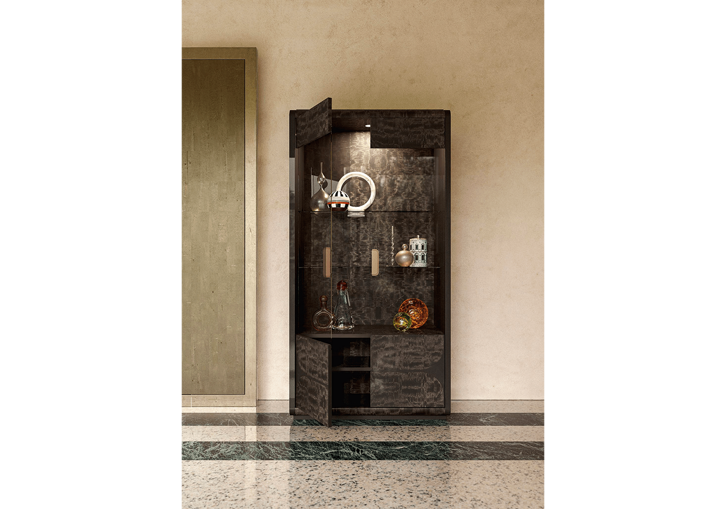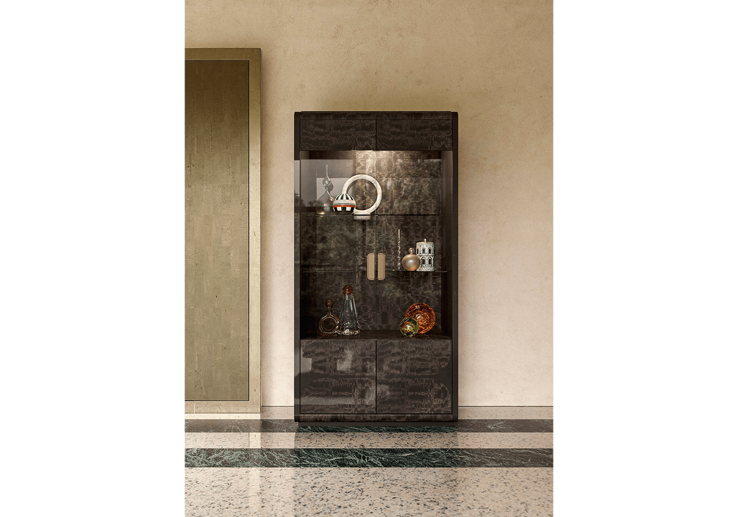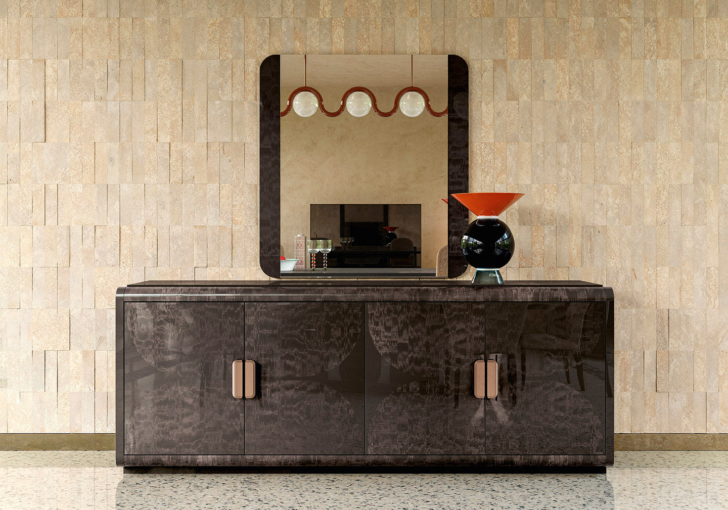 The Nyx table features a rich chocolate high-gloss finish with geometric round inlays on the top and a curved-shaped base, combining artistic sophistication with luxurious refinement for a standout piece in any interior.