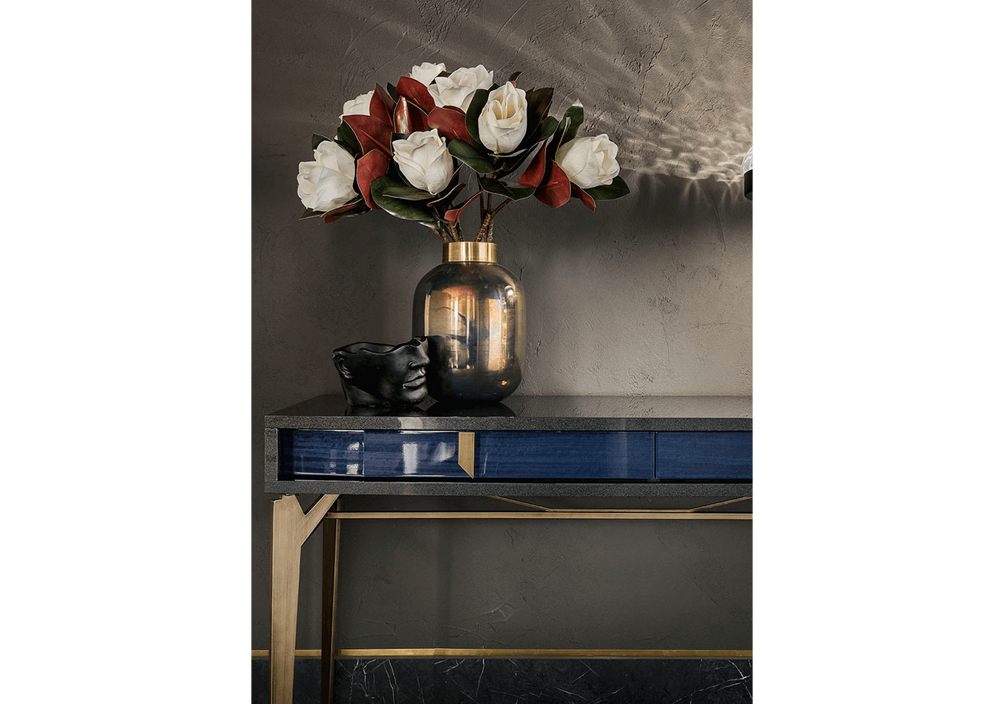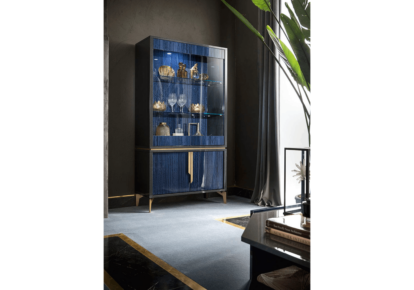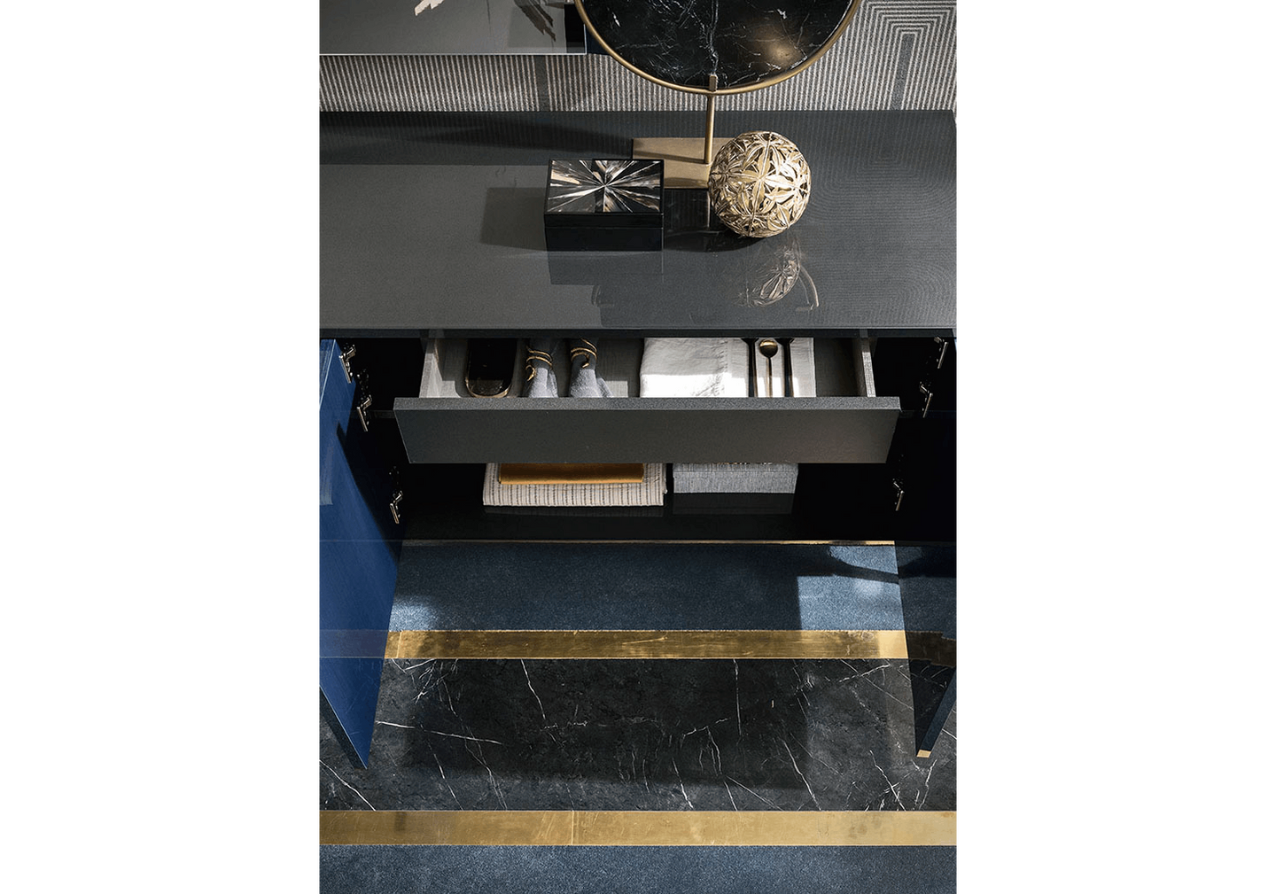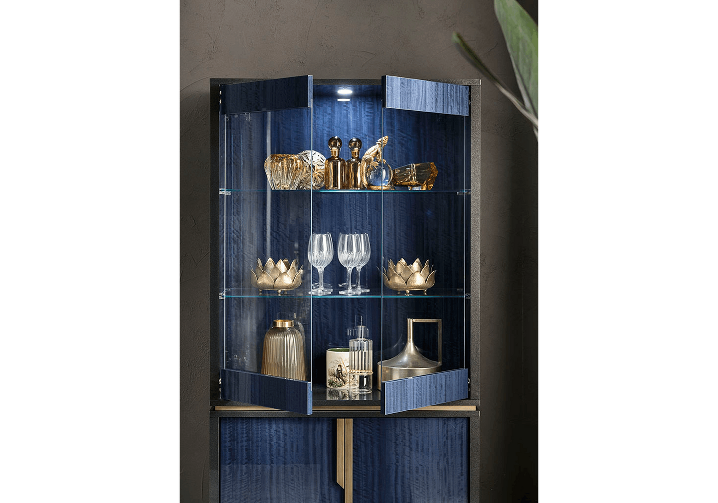 The high-gloss Cobalt Eukalyptus finish highlights the angled look of the doors on the fronts of the pieces in this collection.