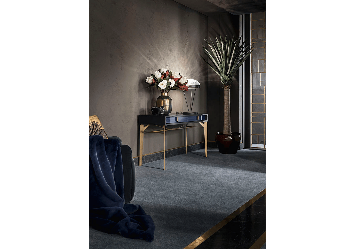The table, available in no less than 3 sizes, two of which are extendable, stands out for having two matching finishes and for the unusual way the legs are joined with brushed metal profiles.
