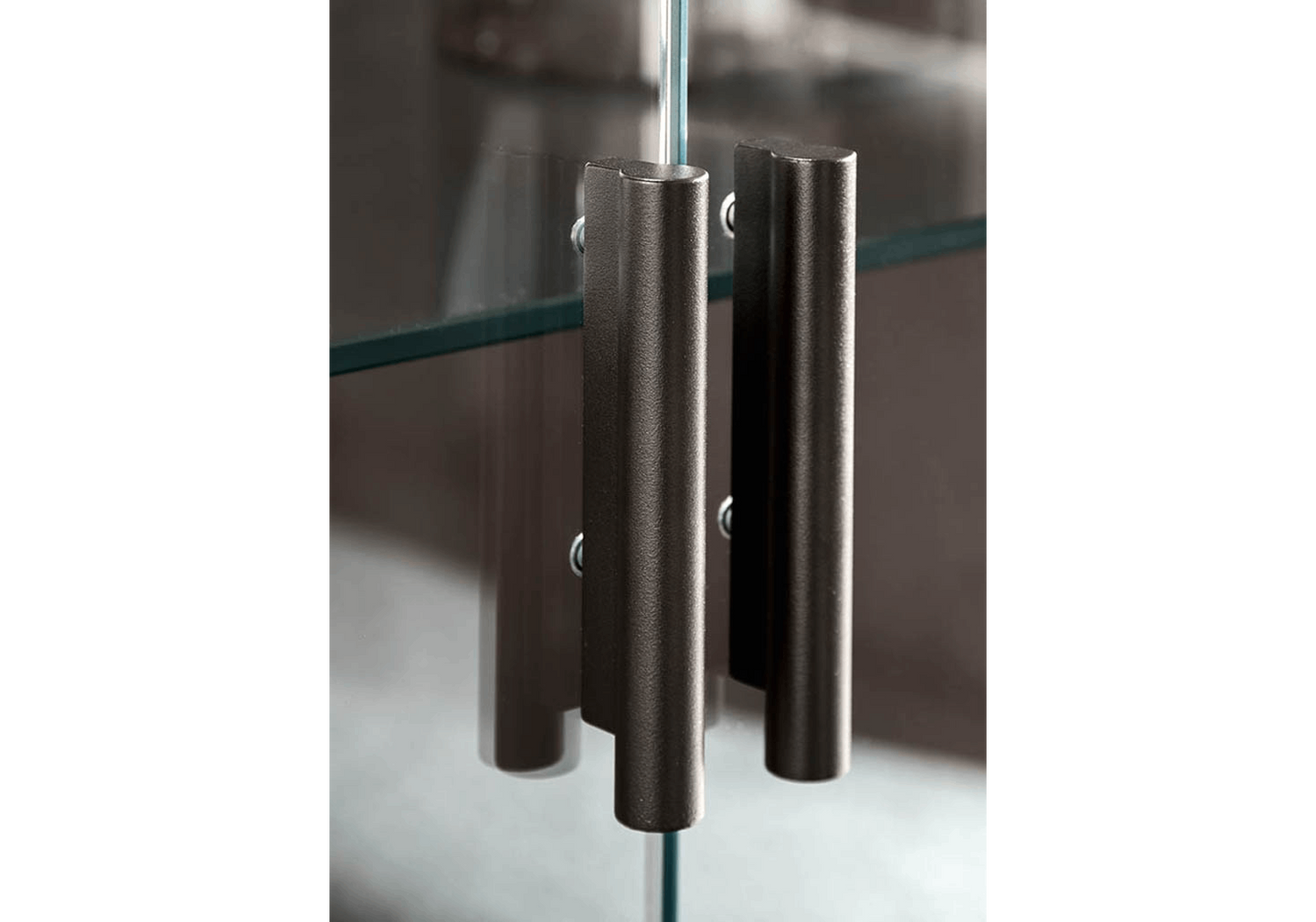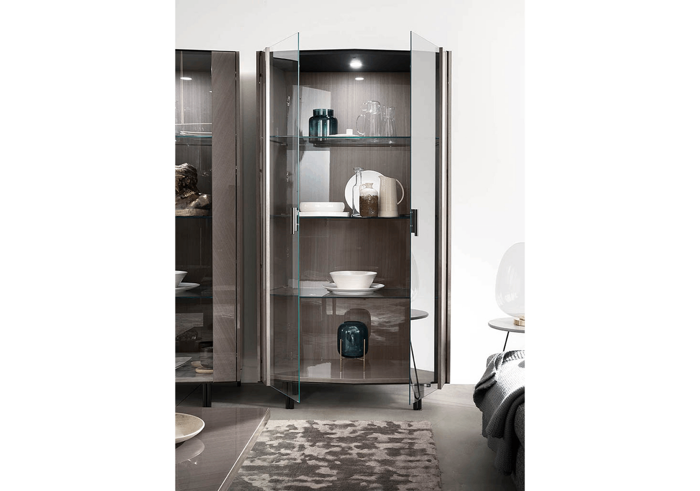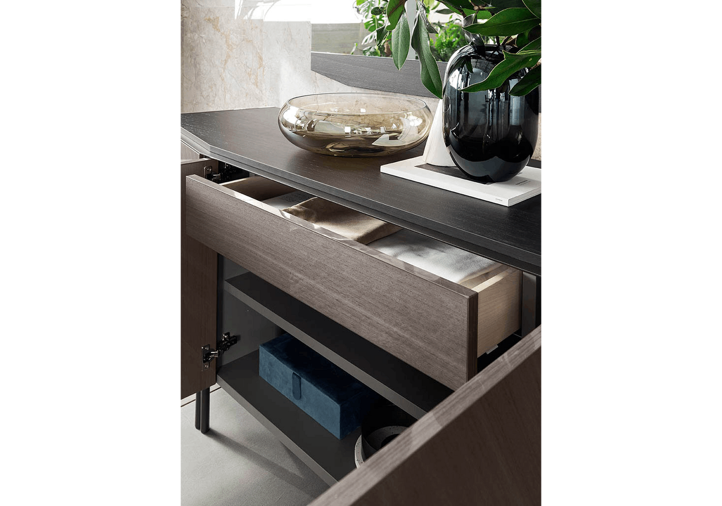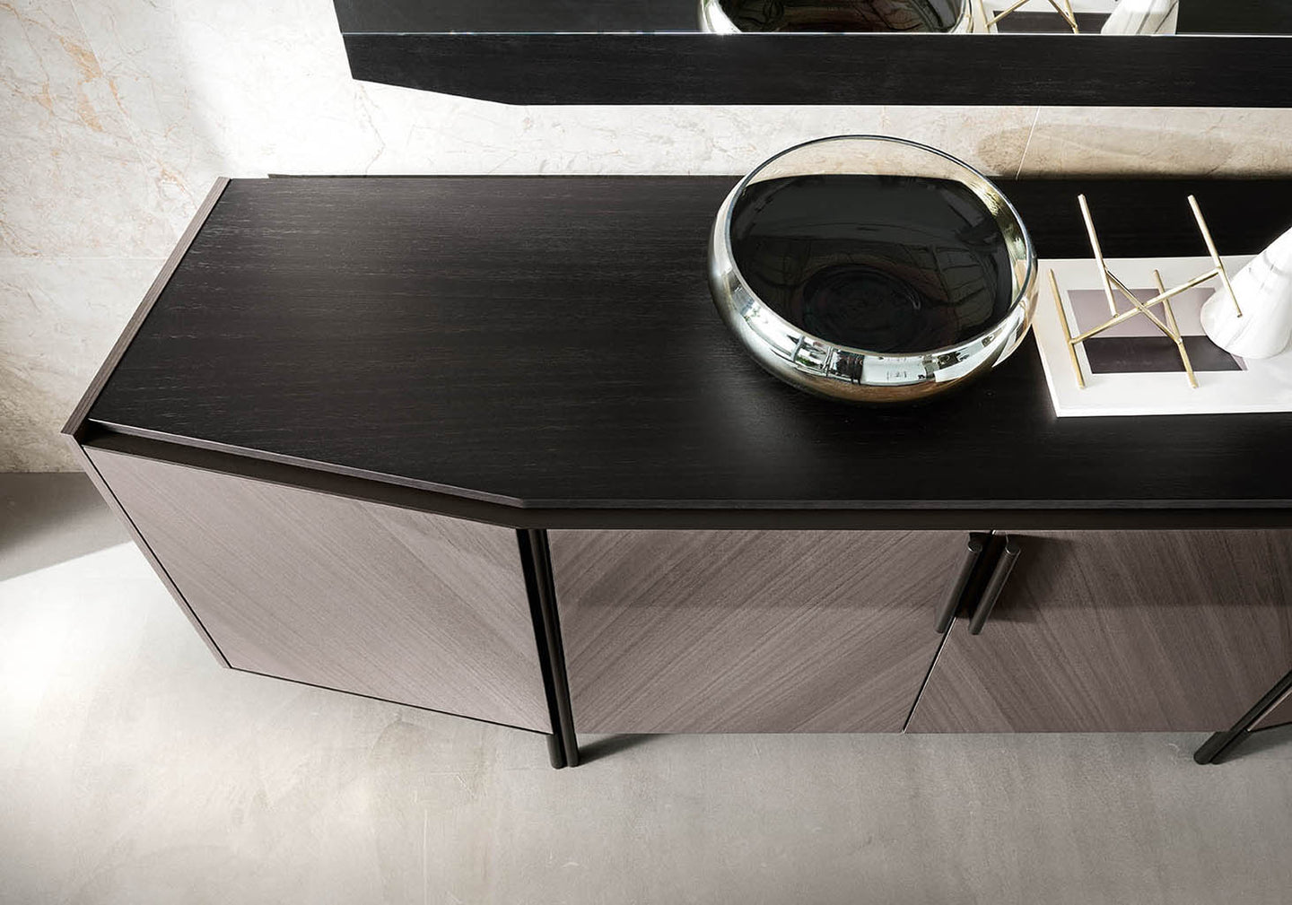 The sloping doors on the fronts create a play of reflections that shows off the high gloss finish of the eucalyptus.