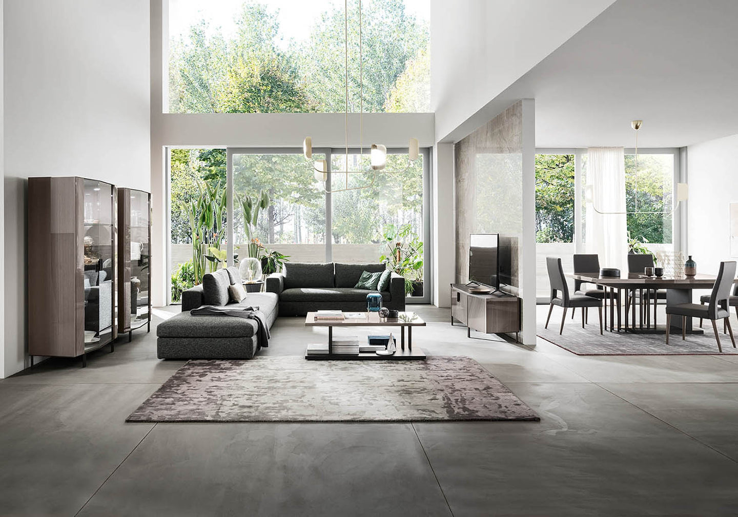 The table, available in no less than 3 sizes, two of which are extendable, has a base in original shapes that create a sense of playful suspension through cylindrical metal bars.